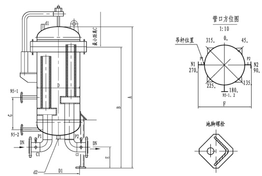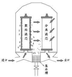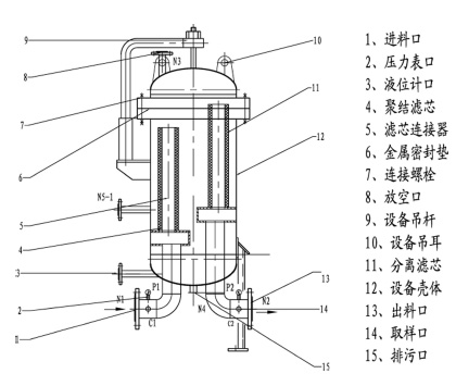 | 结构 液一液聚结分离器是一个内部装有两组不同功能的滤芯,外部装有液位计、压差计、放气阀、排污(放水)阀、在线取样接头等附件的金属壳体。液一液聚结分离器的基本结构如下图: |