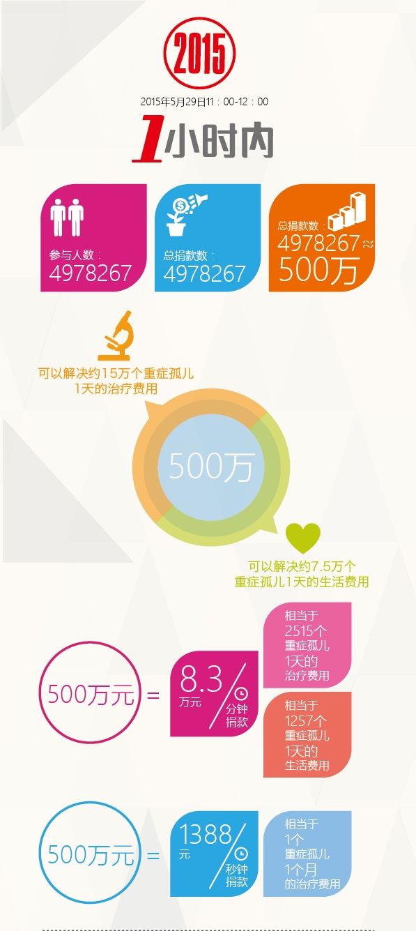 这样一个数量的捐款,将给重症孤儿的救助带来什么实质帮助?具象的数据拆解如下:百度与世茂集团捐助的500万元,可以解决15万个重症孤儿1天的治疗费用,解决约7.5万个重症孤儿1天的生活费用。平均到每分钟,大约捐款8.3万元,如果再细化到每秒钟捐款1388元,大约相当于1个重症孤儿1个月的治疗费用。