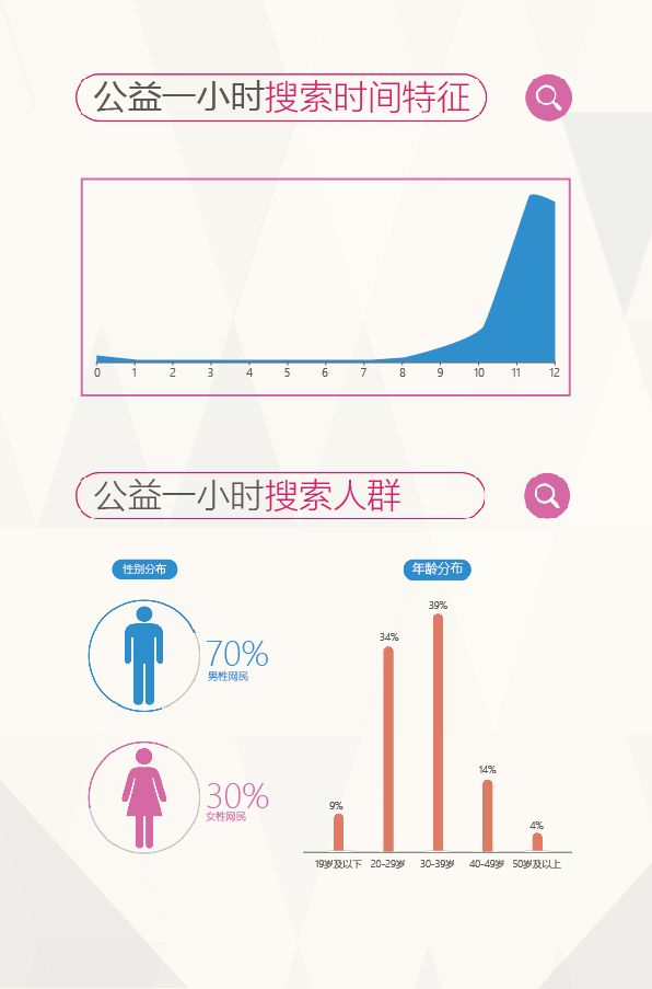 此外,此次公益一小时活动在传播影响上也展现出了一些新的变化。根据百度指数相关数据显示,在参与本次活动的人群地域分布上,北京、浙江、广东、江苏、上海等大城市和沿海发达地区排在前列。而20到39岁区域内的男性网友,成为此次参与公益一小时的核心主力,而这一跨度也基本覆盖了当前互联网参与的主流人群。